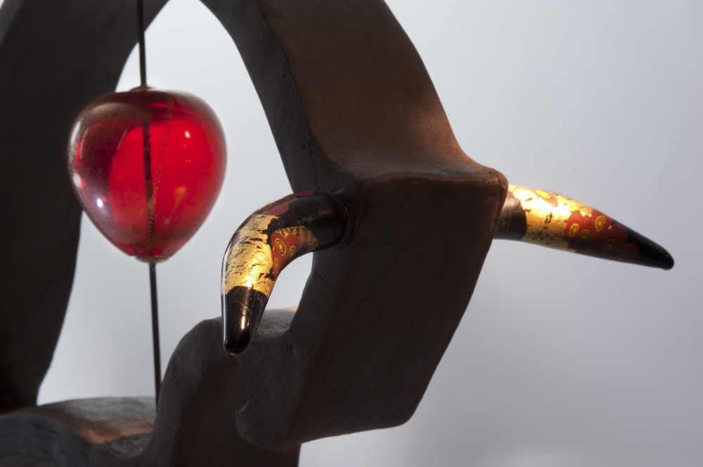 Per le corna ho usato l’unicità del prezioso vetro rosso di Murano, appositamente creato da un talentuoso maestro vetraio, che ha voluto evidenziare con questa qualità di vetro la luce sanguigna che avvolge l’attimo in cui tutto si compie.